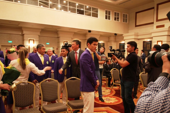 Сегодняшняя встреча была хоть и с участием главы НОК и министра культуры и спорта, но все же это было не такое масштабное мероприятие, как ожидает спортсменов завтра. Между тем герои Олимпиады старались выглядеть безупречно. Когда уже все приглашенные были на месте, и Тимур Кулибаев ждал только министра, чтобы начать, появился серебряный призер Олимпиады Елдос Сметов и девушка, по всей видимости, отвечающая за организацию встречи досадно произнесла: "Это же не та форма".