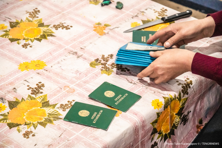Алма показывает нам свои два удостоверения к орденам "Қүміс алқа" и "Алтын алқа" (за "Алтын алқа" она получает 19 тысяч тенге и еще 85 тысяч за многодетность), здесь же она раскладывает кипу свидетельств о рождении - всего их семь.