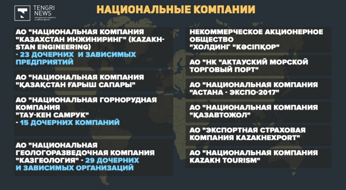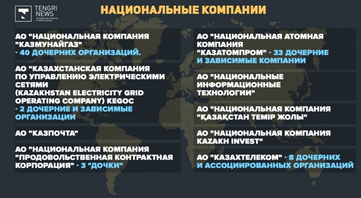 В Казахстане зарегистрировано 19 национальных компаний. К примеру, в АО "НК "КазМунайГаз" - 40 дочерних организаций, в "Казатомпроме" - 33 "дочки", в "Казгеологии" - 29 , у "Казахстан инжиниринга" - 23 дочерних и зависимых предприятия, в "Национальной горнорудной компании "Тау-Кен Самрук" -15, у "Казахтелекома" - восемь "дочек", в "Продовольственной контрактной  корпорации" - три, в KEGOC - две дочерние организации.