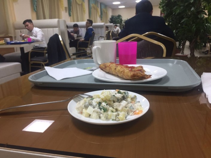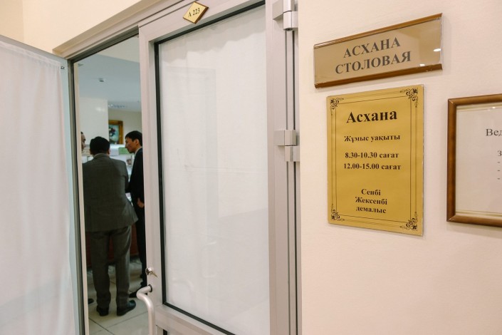 В здании правительства работают столовая и буфет. Завтрак в виде яичницы с сардельками, пирожком с зеленым луком и яйцом и кофе здесь стоят 662 тенге.