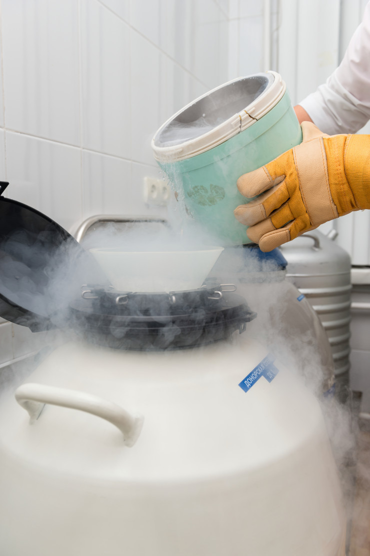 Яйцеклетки хранятся в сосудах Дьюара - особых резервуарах с жидким азотом - при температуре минус 196 градусов. Они могут там находиться неограниченное количество лет.