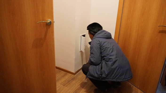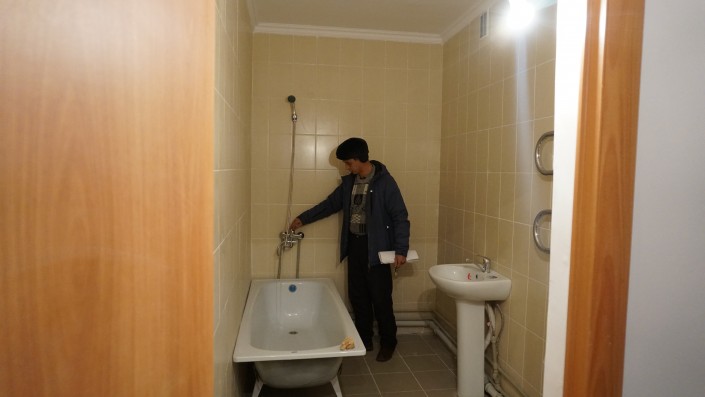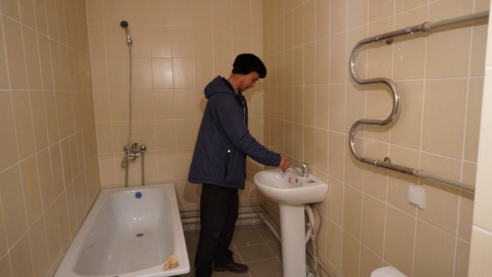 Местный активист Жандарбек, или, как его все называют, Жора, не спешит проявлять радость. Он очень внимательно проверяет выданные его семье две квартиры. К жилым помещениям у него есть претензии.