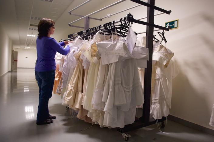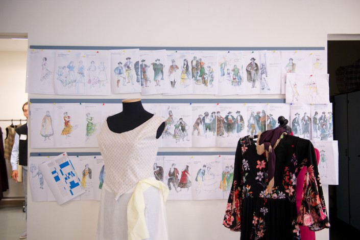 Художник-сценограф Эцио Фриджерио проверяет, правильно ли бутафоры использовали все оттенки, где-то добавляет свои штрихи. Очень интересной получилась сцена ярмарки. Здесь все как на настоящем испанском рынке - шляпы и сумки, фрукты и овощи представлены в изобилии. Сумки сделаны со специальными потертостями, чтобы под светом софитов могли выглядеть естественно, в противном случае при попадании на них театрального света, они рискуют стать глянцевыми и "выбьются" из общего стиля постановки.