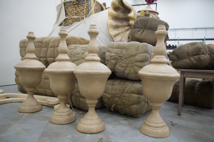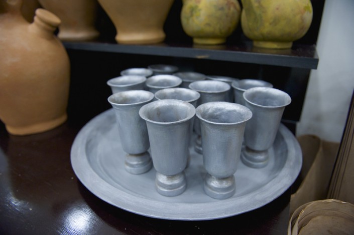 "Необычной формы посуда, кувшины, вазы удивили нас сразу, как только мы увидели эскизы. Изготовлялись они по технологии папье-маше, но вначале отливались формы, вытягивались глиной, затем заливались гипсом, а уже потом лепилось папье-маше, - рассказывает художник-бутафор, скульптор Даурен Омаров. - Бутафорские ружья по технологии изготовления идентичны настоящим: дерево, металл и чеканка, а если добавить специальный механизм, то они смогут даже стрелять. Светильники выполнены из дерева, но так задекорированы, что выглядят, как будто сделаны из старой латуни, с проступившей на железных вставках ржавчиной".