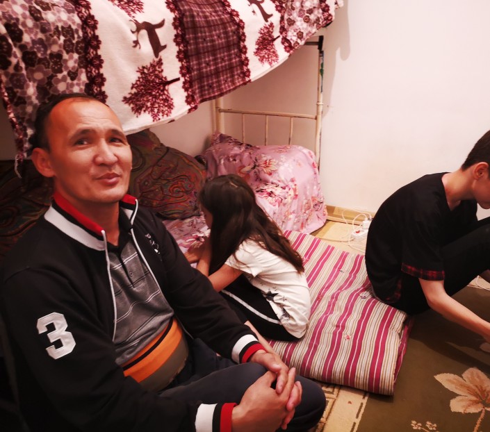 Исатай с сыном и дочерью в комнате на автомойке, 2019 год