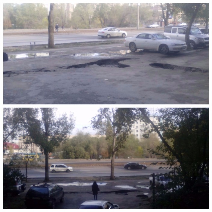 Открывает новый выпуск нашей рубрики фото провалившегося асфальта после замены труб на пересечении улиц Толе би и Тлендиева в Алматы.