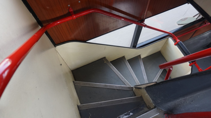 Лестницы на второй этаж расположены в двух местах: в начале салона, ближе к водителю, и напротив центрального входа.