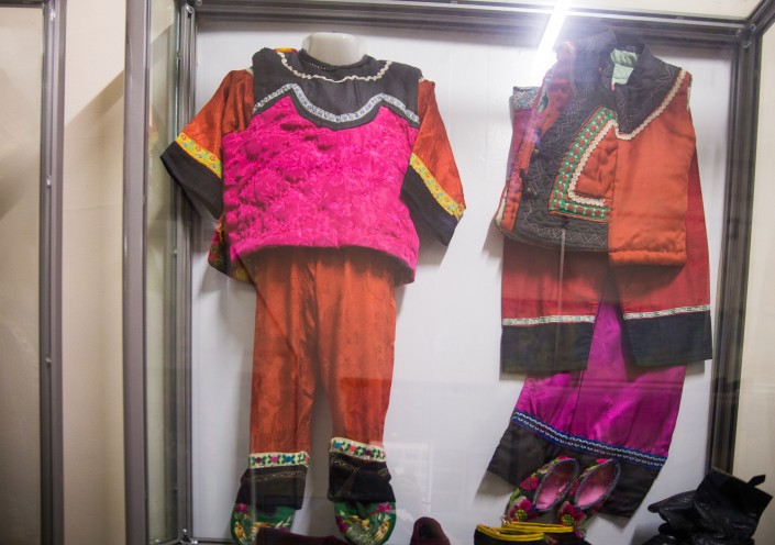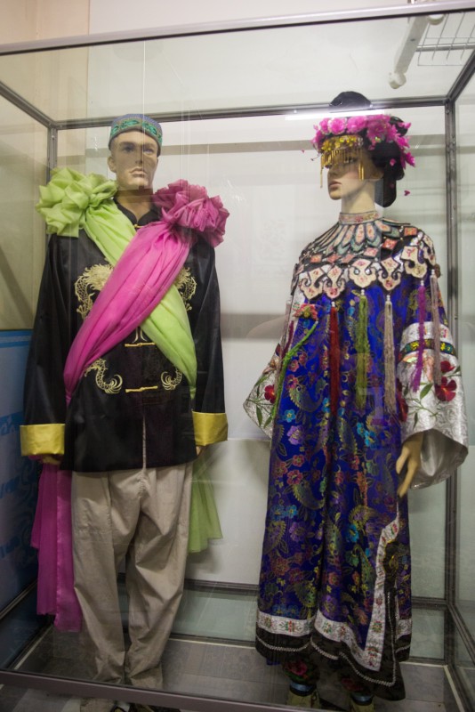 По мнению Лочь, из всех традиций у дунган в Казахстане наиболее сохранились свадебные обряды. У девушек есть отдельное платье на девичник - вот оно на манекене. Учитель расстраивается, глядя на него: брали на выставку и попортили, пришлось восстанавливать с использованием современных тканей. И отдельное платье на свадьбу. Существует легенда о происхождении накидки, которую называют "шалью павлина". Будущий наследный император на охоте прилег отдохнуть и увидел красивую птицу. Хотел поймать - не ловится. Решил пристрелить, натянул лук - а она превратилась в девушку-красавицу. Когда пришло время жениться, он сказал маме: "Я женюсь только на той девушке, которую встретил в лесу". Мама поняла, что это мифическая птица Феникс, и дала указание придворным сшить костюм с широкими как крылья рукавами. Чтобы напоминал ее сыну встреченную птицу.