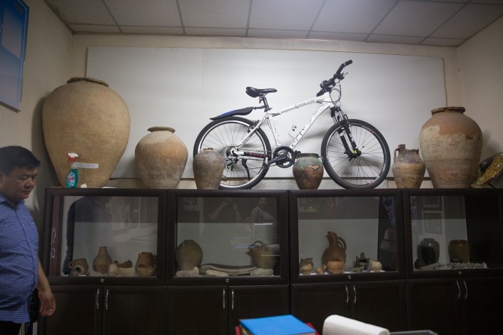 Больше всего в музее нас удивил велосипед, стоящий среди старинных ваз. Лочь извиняется: говорит, что не успел оборудовать другое место. Нам же этот рояль в кустах, это соединение прошлого и настоящего очень нравится. Велосипед появился здесь пять лет назад, когда праздновали 135 лет со дня образования села. Группа масанчинцев совершила пробег по той дороге, которой прошли их предки. 40 человек проехали на велосипедах 5 000 километров - путь от китайского Сианя до Масанчи занял два месяца. Один из велосипедов с автографами подарили фонду музея.