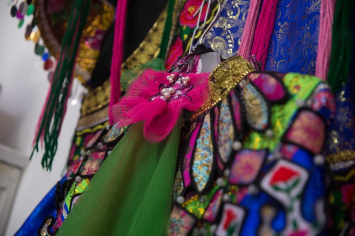 Мужской свадебный костюм - с красной и зеленой лентами: красная - символ счастья, зеленая - символ ислама, символ жизни. Костюмы отшивают вручную, но мастеров очень мало. Полный комплект женского платья будет стоит 300-400 долларов, мужской - чуть дешевле.