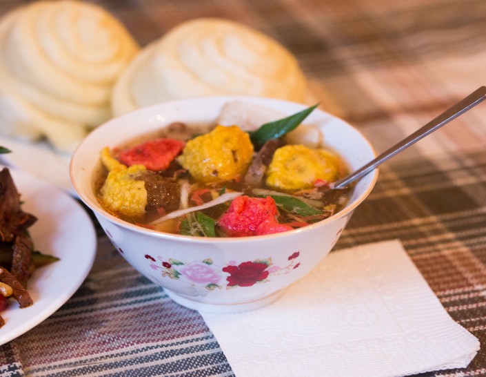 В Интернете пишут, что "дунганские щи" - это праздничное блюдо. Так и есть. На каждый праздник - свое количество ингредиентов: от девяти до 72. Блюдо многосоставное: котлеты коричневого, красного и желтого цветов (покрашены пищевым красителем), рис, бульон, требуха или лапша с мясным бульоном, или фунчеза, отваренные на пару пампушки, которые дунгане называют парным хлебом. Обычно все это подают по отдельности, человек сам смешивает все в суповой тарелке, заливая бульоном. Нам подали порционно.