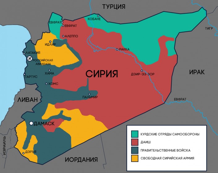 В сирийском конфликте есть три основные силы - правительственные войска Башара Асада, вооруженная оппозиция и силы "Исламского государства". Каждая из сторон хотела бы сломить две других. Оппозиции помогают США, Саудовская Аравия и Катар, правительственным войскам Асада - Россия, Иран, Ирак. Часть территории Сирии контролируется "Фронтом Ан-Нусра" (террористами "Аль-Каиды") и курдами, этническим меньшинством на севере страны.