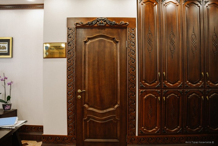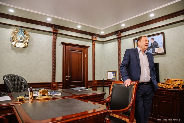 Кстати, вот так выглядит офис Сауэра. Возле двери у входа в его кабинет висит табличка, где, помимо должности, указано, что он обладатель высокой награды - Қазақстанның Еңбек Ері, то есть Герой труда.