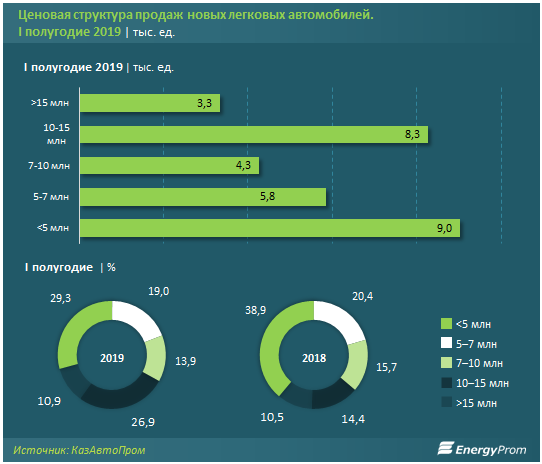 Сегменты бизнес (10-15 миллиона тенге) и премиум-класса (свыше 15 миллионов тенге) заняли соответственно 26,9 процента (8,3 тысячи авто) и 10,9 процента (3,3 тысячи) рынка новых автомобилей.