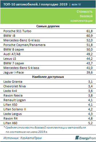 В рейтинге самых дорогих моделей лидируют Porsche 911 Turbo (61,8 миллиона тенге), BMW i8 (60,9 миллиона тенге), Mercedes-Benz G-klass (52 миллиона тенге), Porsche Panamera (51,8 миллиона тенге) и BMW 8 серия (50 миллионов тенге).