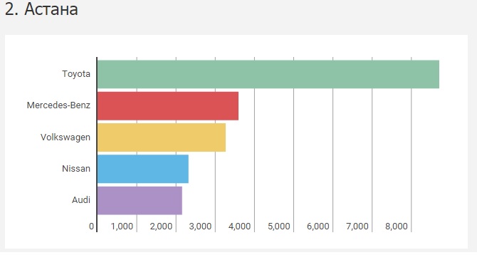 "Но если копнуть глубже и рассмотреть ситуацию не в масштабе страны, а в пределах городов, то можно найти и исключение из правил. Рассмотрев вторичный рынок в пяти городах с наибольшей долей перерегистраций (Алматы, Астана, Шымкент, Караганда и Тараз), мы вывели отдельный рейтинг популярности марок среди б/у автомобилей", - пишет издание.