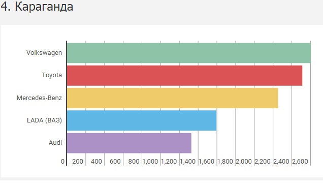 В 2015 году в Караганде оказалось 18 тысяч перерегистраций легковых автомобилей. Город является единственным в стране, где Toyota лидером не является. Лидером оказался Volkswagen с результатом 2,6 тысячи регистраций. Toyota довольствуется "серебром" (2,5 тысячи), а "бронзу" заработал Mercedes-Benz (2,2 тысячи).
