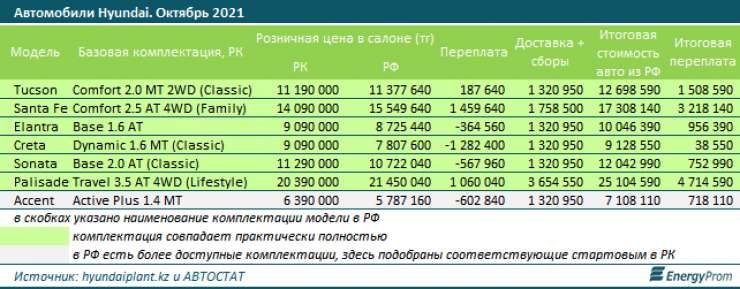 Некоторые модели, например, Tucson Comfort 2.0 MT 2WD (Classic) и Santa Fe Comfort 2.5 AT 4WD (Family), в РК стоят изначально заметно дешевле. Другие, к примеру Elantra Base 1.6 AT или Creta Dynamic 1.6 MT (Classic), дешевле обойдутся в РФ.
