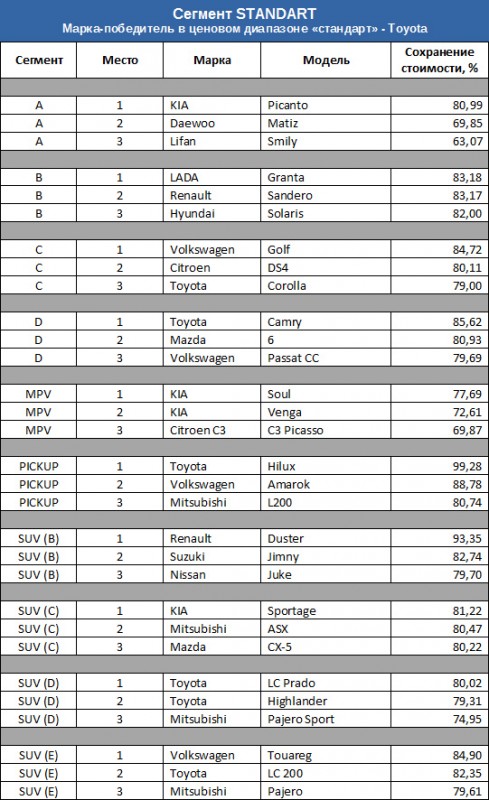 Самым выгодным автомобилем для последующей перепродажи в сегменте "A" стал Kia Picanto. Эта модель сохранила за три года 80,99 процента от своей первоначальной цены. Лидером В-класса стала Lada Granta (83,18 процента). Победителем в C-сегменте стал Volkswagen Golf (83,18 процента). Первое место в D-классе заняла Toyota Camry с результатом 85,62 процента.