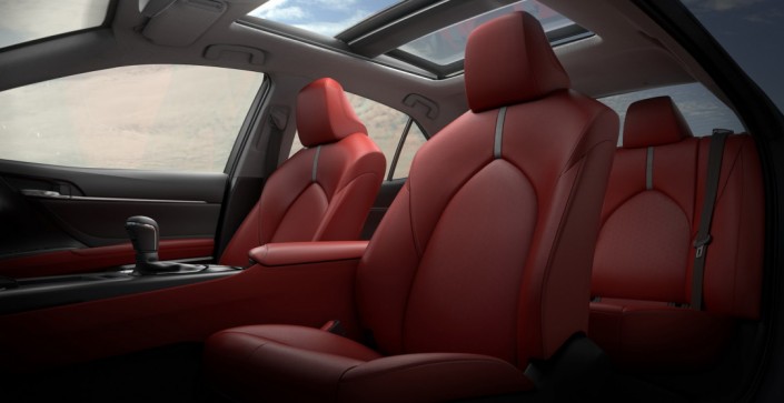 Седан Toyota Camry 2018 модельного года получил полностью пересмотренный интерьер, который сочетает в себе "функциональность, футуристический стиль, уклон на личное пространство и высокий уровень исполнения". На заднем ряду автомобиля стало просторнее и комфортабельнее, а передние кресла спроектированы заново для улучшения эргономики. В салоне автомобиля можно обнаружить восьмидюймовый экран мультимедийной и навигационной системы, используемый также для климатических настроек, а также семидюймовый информационный монитор на приборной панели.