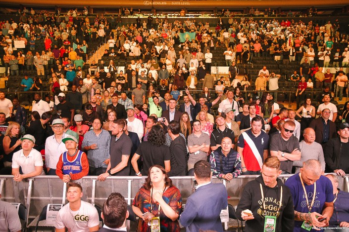 Атмосфера была невероятная с самого начала, когда гости, зрители начали приходить. Первое, что бросилось в глаза, - это то, что и американцы, и мексиканцы, и даже канадцы - очень много людей были в футболках, бейсболках с надписью GGG. Очень много было фанатов Головкина! Сразу было понятно, что большинство зрителей пришли посмотреть именно на него: справится ли он со своим соперником и сможет ли доказать, что он настоящий чемпион.