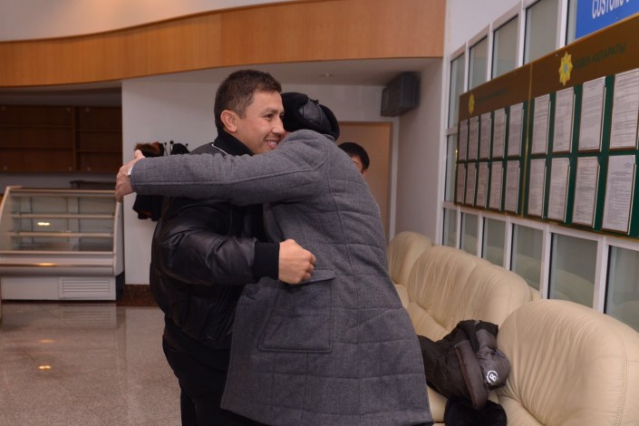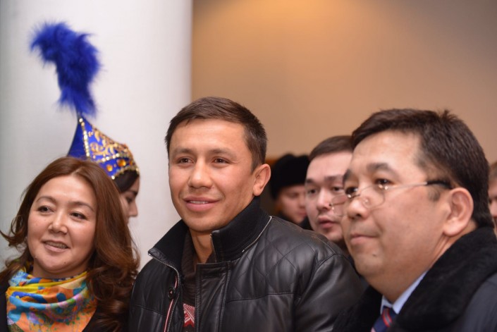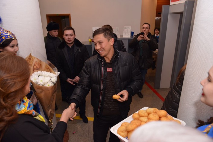 Геннадий, несмотря на нелегкий перелет, все же уделил внимание встречавшим его астанчанам. Боксер попробовал предложенные ему кумыс и баурсаки, поблагодарил всех и отправился в город.