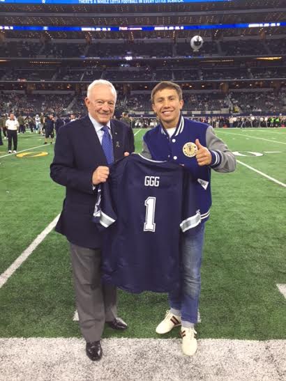 Владелец клуба Джерри Джонс вручил Головкину именной свитер с номером один. "Это большая честь наконец-то быть здесь. Спасибо Джери Джонсу за именное джерси "Даллас Ковбойз", - написал боксер в своем микроблоге в Twitter.