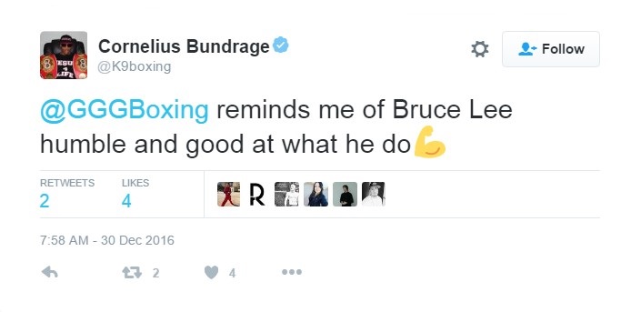 "Геннадий Головкин напоминает мне Брюса Ли своей скромностью и тем, как он хорошо делает свое дело", - написал Бандрейдж в твиттере.