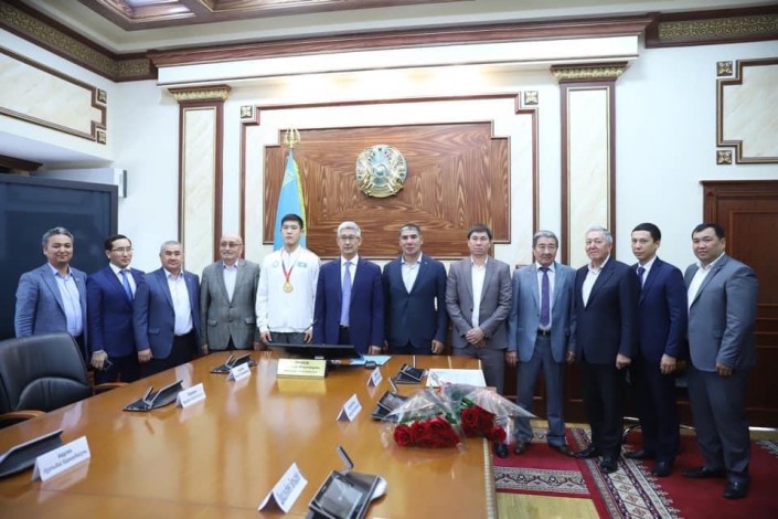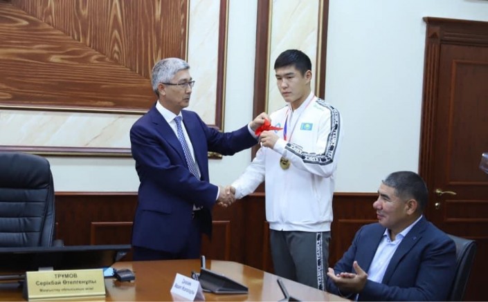 Новоявленного чемпиона и его тренера Марата Жакиева принял аким Мангистауской области Серикбай Трумов.