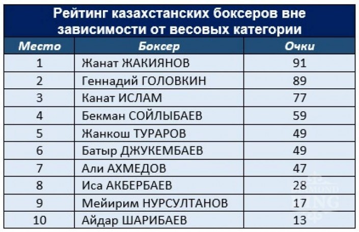 Как сообщает спортивный портал Vesti.kz, перед боем с британцем Жанат Жакиянов возглавил первый в своем роде рейтинг казахстанских боксеров-профессионалов вне зависимости от весовых категорий, составленный официальным сайтом промоутерской компании Diamond Ring.