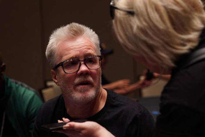 Во-первых, фотографировать бой могут только специально аккредитованные фотографы в специально установленном месте. Всем остальным запрещено делать фото и видео боя, в том числе на камеры телефонов.