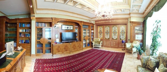 Интерьер выполнен в классическом стиле. Использованы натуральный мрамор, 13 килограммов сусального золота, слоновая кость, дерево. Каждая потолочная фреска и рисунки на мраморном полу сделаны художниками вручную.