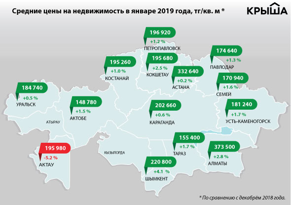 Городами, где относительно января 2018 года жилье подешевело, стали Актобе (-4 процента) и Актау (-8,8 процента).