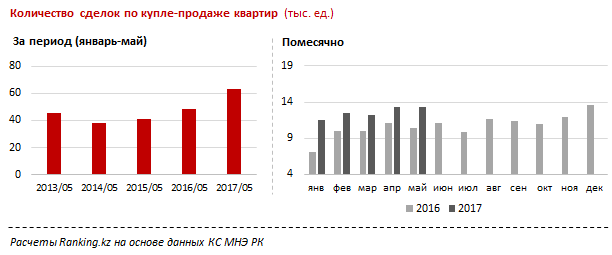 Всего за первые пять месяцев 2017 года в РК было заключено порядка 63 тысяч сделок по покупке квартир, или на 14,4 тысячи сделок больше, чем годом ранее.