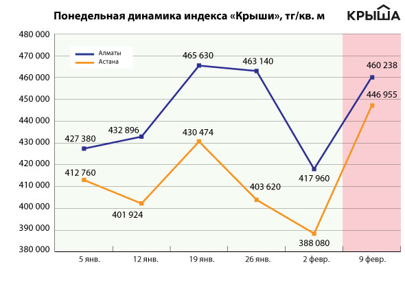 До того, как был введен запрет на цены в долларах, в Астане, к примеру, квадратный метр в среднем стоил 388 тысяч тенге (при курсе 360 тенге это равнялось 1078 долларам). Теперь стоимость квадратного метра составляет 447 тысяч тенге. Прирост составил 59 тысяч тенге, или 15,2 процента за неделю. Аналогичная ситуация наблюдается и в Алматы, где прирост равняется 10,1 процента.