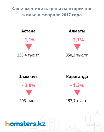 По данным аналитического центра Homsters.kz, в феврале цены на вторичное жилье в крупнейших городах и в регионах республики начали заметное снижение. Большая часть этого снижения прошла во второй половине месяца на фоне заметного укрепления национальной валюты до уровня 312 тенге за доллар.