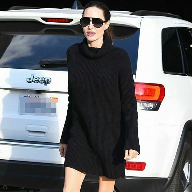 На 42-летней артистке было маленькое черное платье-свитер. Дополняли образ ботильоны на шпильке и солнцезащитные очки-авиаторы, волосы Джоли затянула в хвост.