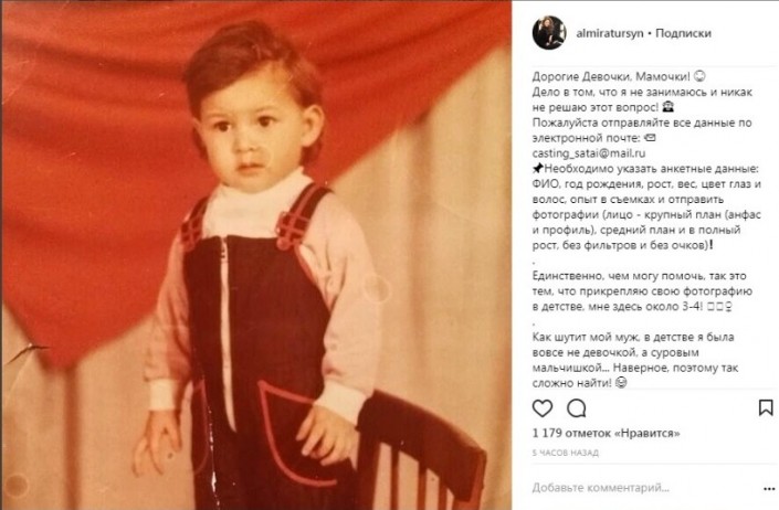 "Дело в том, что я никак не решаю этот вопрос. (...) Единственное, чем могу помочь, так это тем, что прикрепляю свою фотографию в детстве, мне здесь около 3-4 лет. Как шутит мой муж, в детстве я была вовсе не девочкой, а суровым мальчишкой... Наверное, поэтому так сложно найти!" - написала Альмира Турсын на своей странице в Instagram.