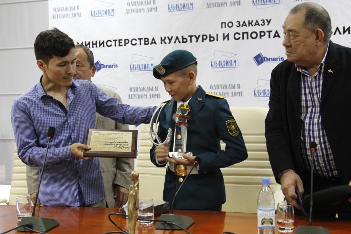 Серик Абишев вручает награду юному актеру. Фото Tengrinews.kz