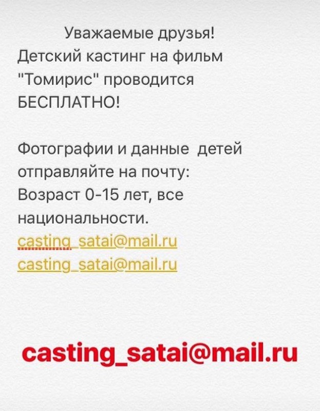 "Что касается рассылки. Мы благодарим людей, которые от себя написали, это нам в помощь. Мы ни в коем случае не обвиняем, но информация немного неправильная. Официальная информация была опубликована в наших официальных лентах в социальных сетях. Мы не берем деньги за кастинг. Он проходит бесплатно. И фотографии нужно отправлять только на почту", - прокомментировала кастинг-директор киностудии "Казахфильм" Жайна Абдиева.
