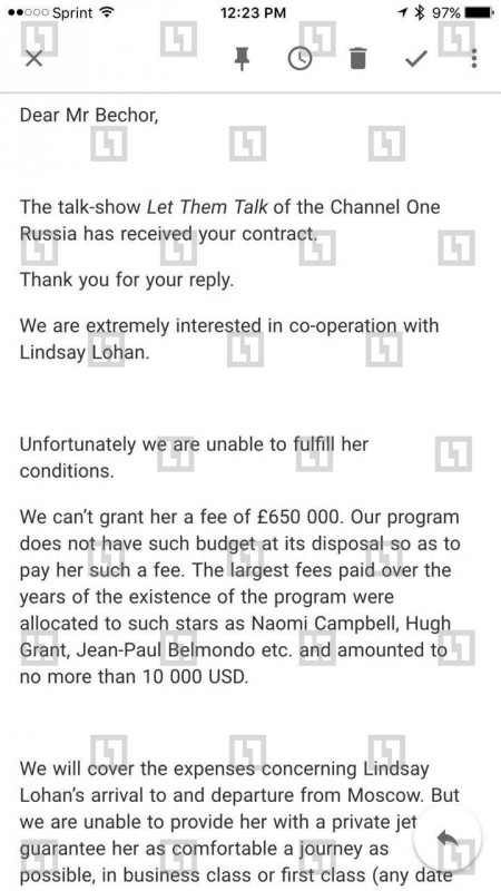 В ответ Лохан выставила список требований, в числе которых гонорар в размере 500 тысяч фунтов стерлингов, номер в отеле "Ритц-Карлтон", круглосуточная охрана, частный самолет для доставки в Москву и обратно, а также годовая виза, парикмахеры и стилисты. Помимо этого, рыжеволосая знаменитость якобы попросила встречу с Владимиром Путиным.