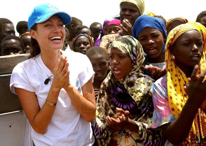Джоли танымалдыққа "Лара Крофт" фильміндегі басты рөлінен кейін ғана ие болған. Анджелина жағдайы нашар елдерде болып жатқан гуманитарлық апатты Камбоджадағы тіршіліктен білген. Онда актриса "Лара Крофт - расхитительница гробниц" фильмінің түсірілімдерінде болған. Сол кезде ол БҰҰ-ның Босқындар ісі жөніндегі комиссиясынан ақпарат алғысы келіп, хабарлама жазады. 2001 жылдың ақпанында Сьерра-Леоне мен Танзанияға алғашқы сапарына аттанып, ондағы жағдайдың нашарлығын көргенде аң-таң болады. Осылайша өзіне Африка мен Азияның қиналған жұртына қалайда көмектесемін деп серт берген екен.