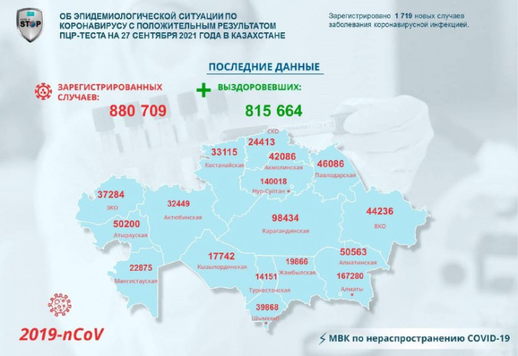 За прошедшие сутки в Казахстане зарегистрировано 1719 новых случаев заболевания коронавирусной инфекцией, передает Tengrinews.kz со ссылкой на данные Межведомственной комиссии по нераспространению COVID-19.