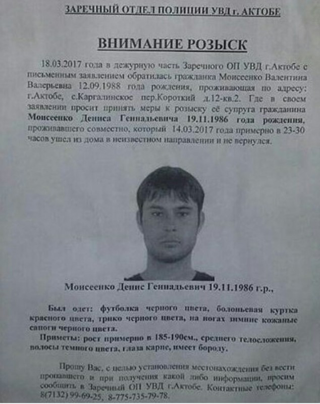 26 марта на балконе одной из квартир в селе Каргалинское в Актобе полицейские обнаружили тело 30-летнего Дениса Моисеенко, пропавшего без вести за две недели до этого. Труп мужчины был завернут в ковер и лежал на балконе девять дней, пока соседи не почувствовали скверный запах.