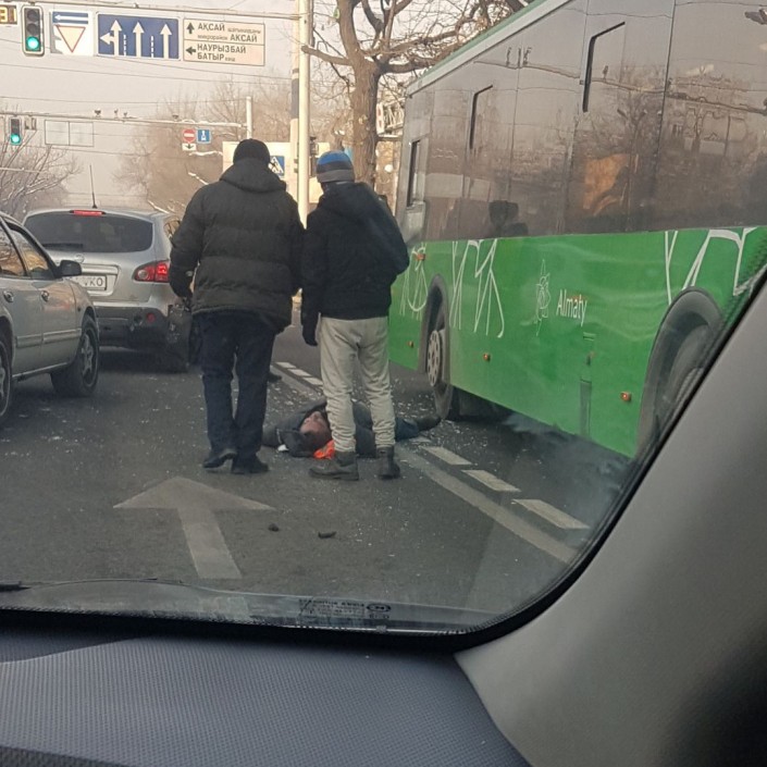 Мужчину сбили в Алматы, передает корреспондент Tengrinews.kz. Фотография ДТП появилась в социальных сетях, рядом с мужчиной, лежащим на земле, стоит автобус муниципального автопарка.