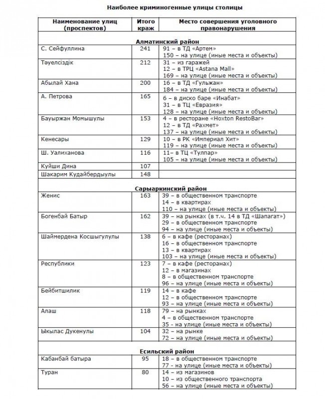 По статистике комитета, в тройку самых криминогенных в Астане входят улицы имени Сакена Сейфуллина, Тауелсыздык и имени Абылай хана. Все три расположены в районе "Алматы". В районе "Сарыарка" самыми криминогенными признаны проспекты Женис, Богенбай батыра и улица Шаймердена Косшыгулулы. В районе "Есиль" в число криминогенных вошли всего два проспекта - Кабанбай батыра и Туран.