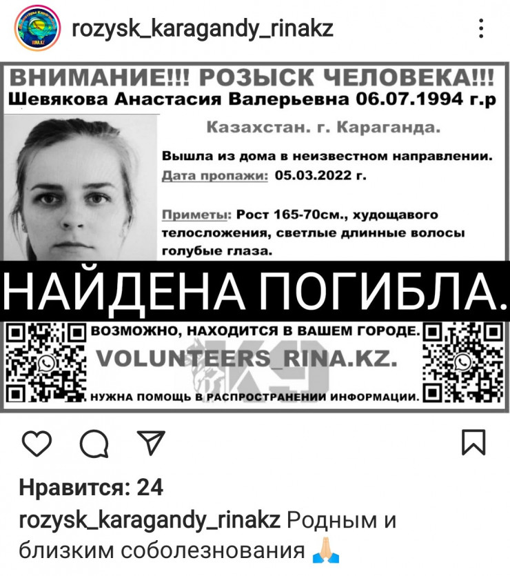 В Караганде найдена пропавшая 5 марта 27-летняя Анастасия Шевякова. Женщину нашли в лесопосадке со следами ножевых ранений, передает корреспондент Tengrinews.kz.