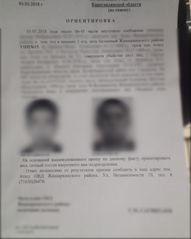 В минувшие выходные в социальных сетях появилась ориентировка на двоих мужчин из Карагандинской области. В документе без печати говорилось о том, что двое жителей поселка Атасу Жанааркинского района разыскиваются по подозрению в двойном убийстве. Также в документе были запечатлены лица разыскиваемых мужчин.