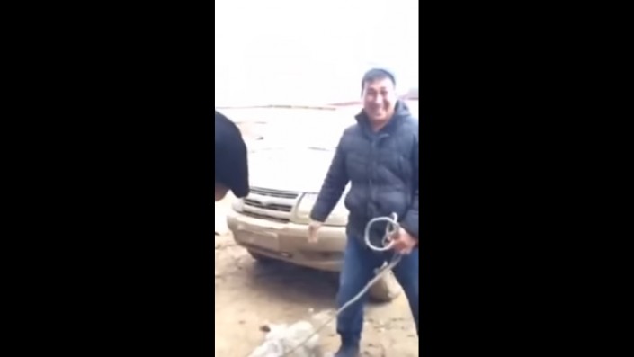 Дикого зверя то и дело избивают. При этом за кадром все время слышен смех. Видео обрывается в тот момент, когда живодеры привязывают волка к бамперу (Источник - КТК).
