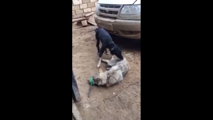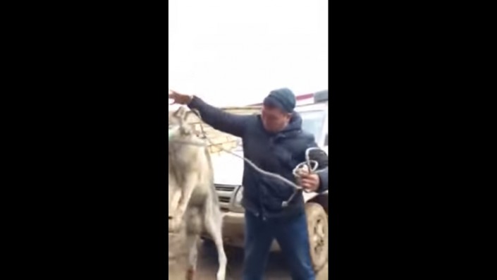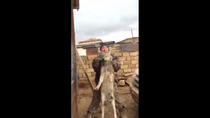В кадре несколько неизвестных мужчин мучают хищника во дворе частного дома, чтобы потом, видимо, продолжить экзекуцию в степи. Охотники-садисты связывают волку пасть, вставив палку, чтобы он не задохнулся до конца истязаний. После животному надевают веревку на шею и пытаются заставить выполнять команды.